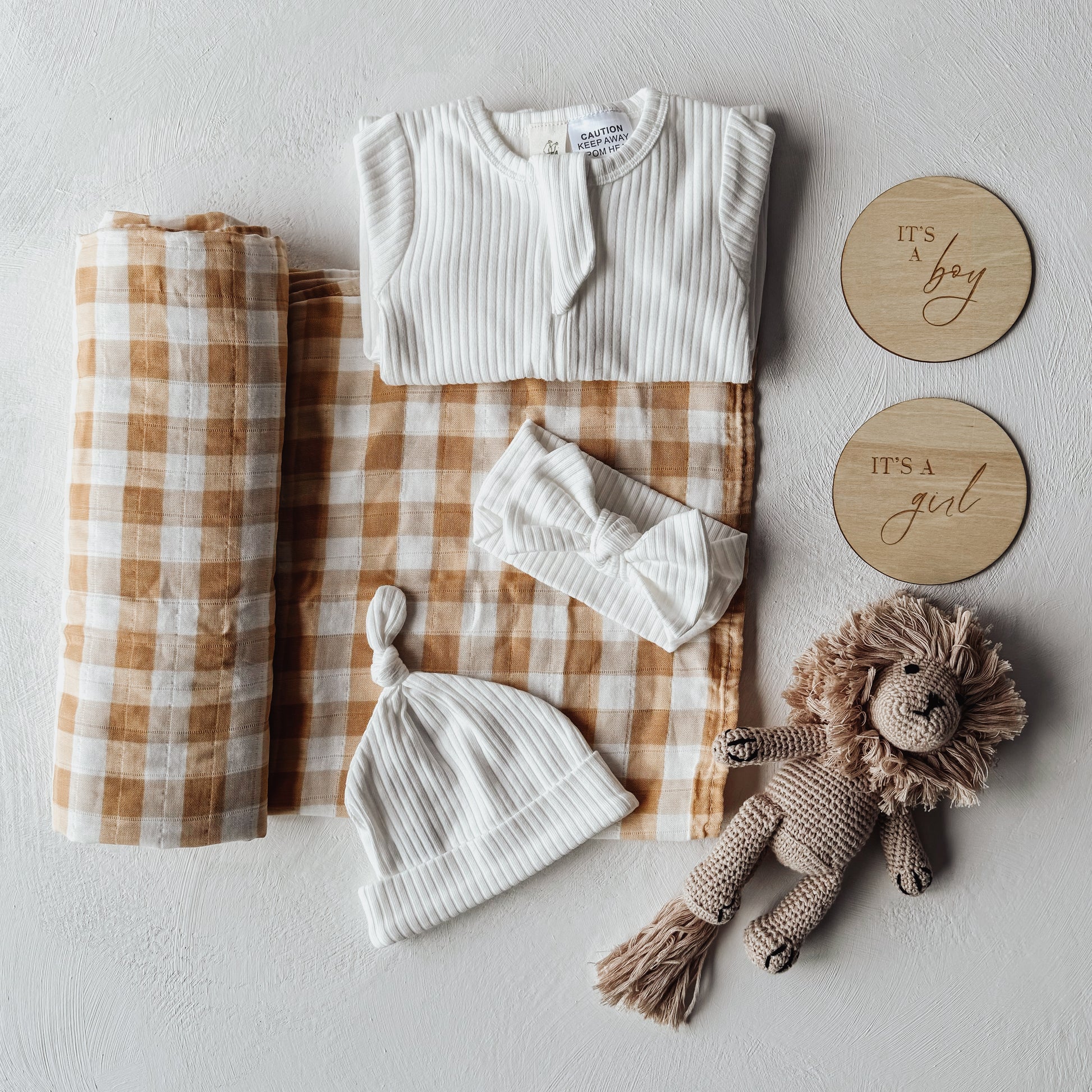 - Honey Gingham organic cotton swaddle (100% cotton)