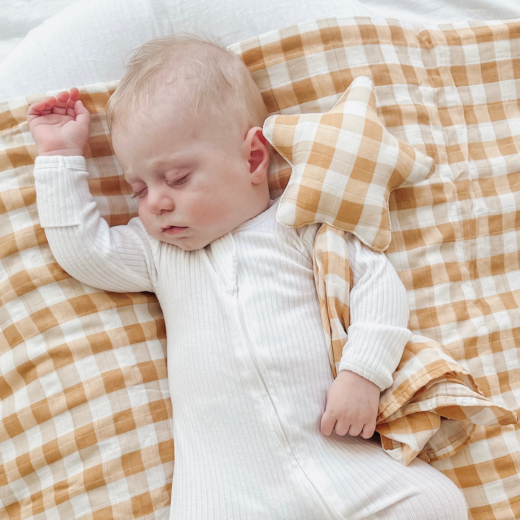 Our Honey Gingham star comforter is super soft, in the most beautiful print and is a must have for your baby.